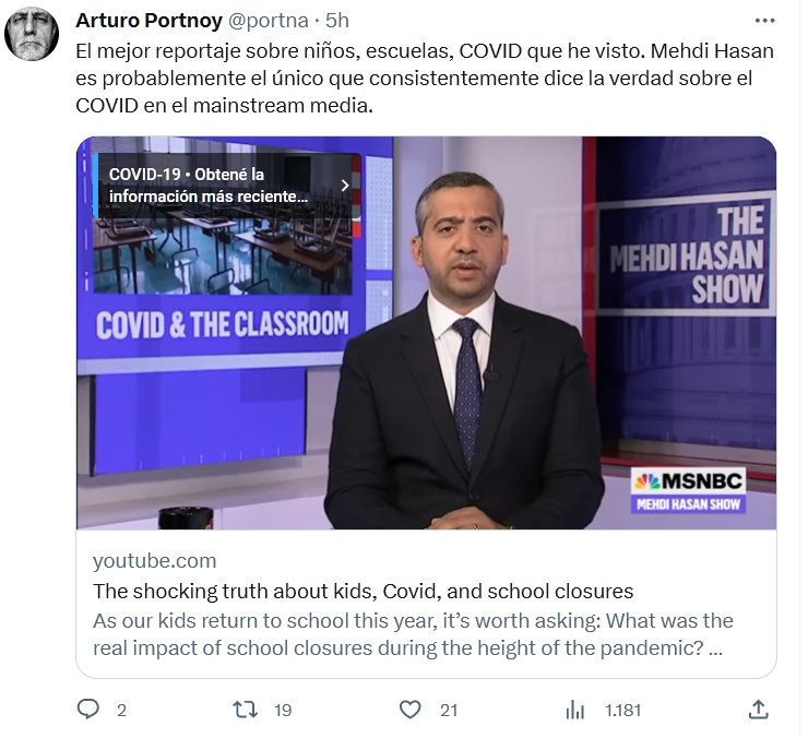 EN INGLÉS El mejor reportaje sobre niños, escuelas, COVID que he visto. Mehdi Hasan es probablemente el único que consistentemente dice la verdad sobre el COVID en el mainstream media. Posted on agosto 25, 2023 por coronado