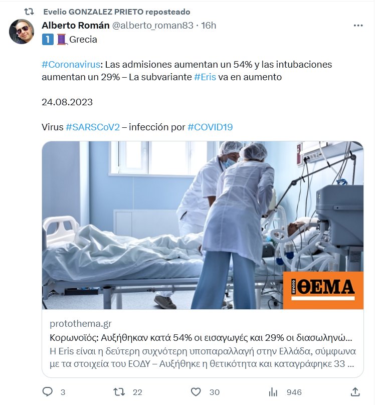 «ES LEVE», PERO TE INTUBAN! Grecia #Coronavirus: Las admisiones aumentan un 54% y las intubaciones aumentan un 29% – La subvariante #Eris va en aumento 24.08.2023 Virus #SARSCoV2 – infección por #COVID19