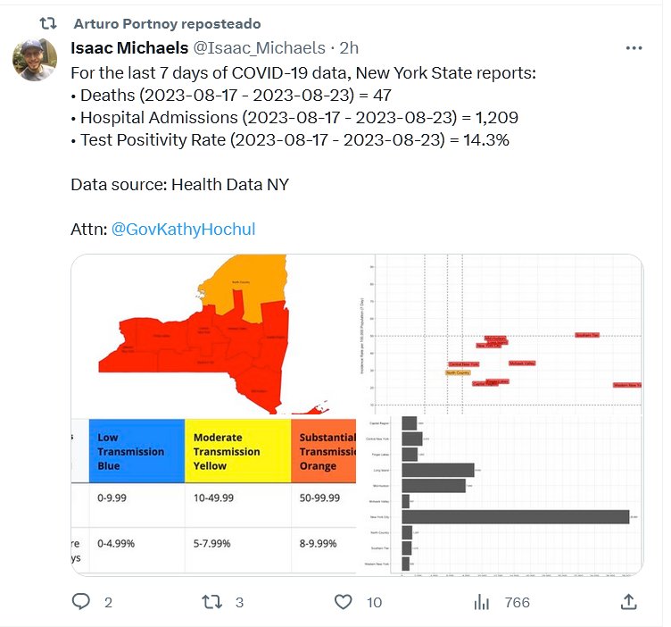 FIN DE PANDEMIA? EN INGLÉS Para los últimos 7 días de datos de COVID-19, el estado de Nueva York informa: • Muertes (2023-08-17 – 2023-08-23) = 47 • Ingresos hospitalarios (2023-08-17 – 2023-08-23) = 1,209 • Tasa de positividad de la prueba (2023-08-17 – 2023-08-23) = 14,3% Fuente de datos: Datos de salud NY