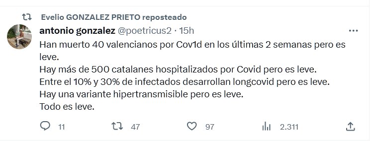Han muerto 40 valencianos por Covid en los últimas 2 semanas pero es leve. Hay más de 500 catalanes hospitalizados por Covid pero es leve. Entre el 10% y 30% de infectados desarrollan longcovid pero es leve. Hay una variante hipertransmisible pero es leve. Todo es leve.