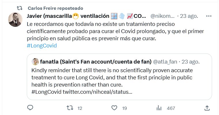 Le recordamos que todavía no existe un tratamiento preciso científicamente probado para curar el Covid prolongado, y que el primer principio en salud pública es prevenir más que curar. #LongCovid