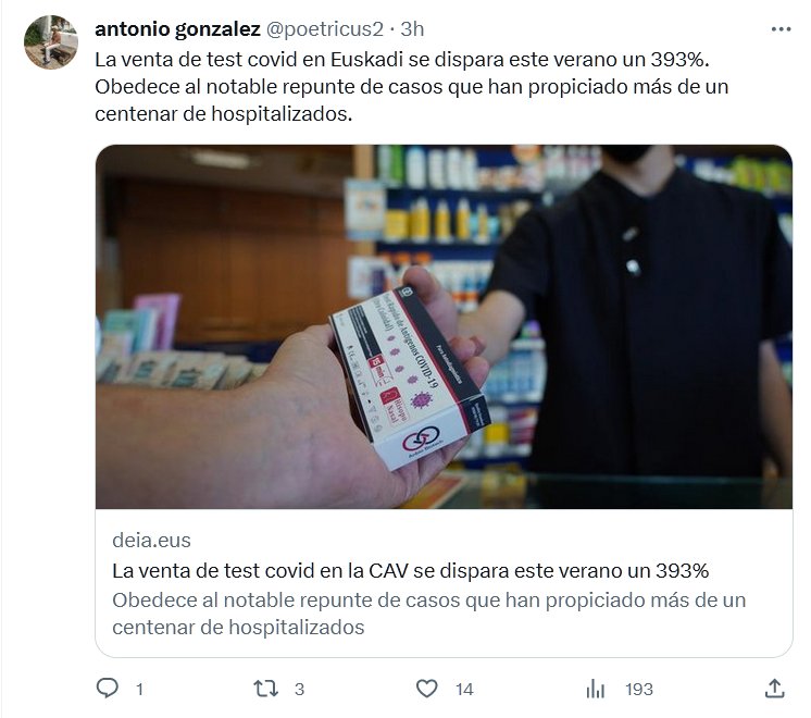 «FIN DE PANDEMIA» La venta de test covid en Euskadi se dispara este verano un 393%. Obedece al notable repunte de casos que han propiciado más de un centenar de hospitalizados. Posted on agosto 26, 2023 por coronado