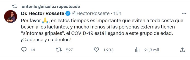 LLAMADO A LA SOLIDARIDAD Dr. Hector Rossete @HectorRossete · 15h Por favor 🙏, en estos tiempos es importante que eviten a toda costa que besen a los lactantes, y mucho menos si las personas externas tienen “síntomas gripales”, el COVID-19 está llegando a este grupo de edad. ¡Cuídense y cuídenlos!
