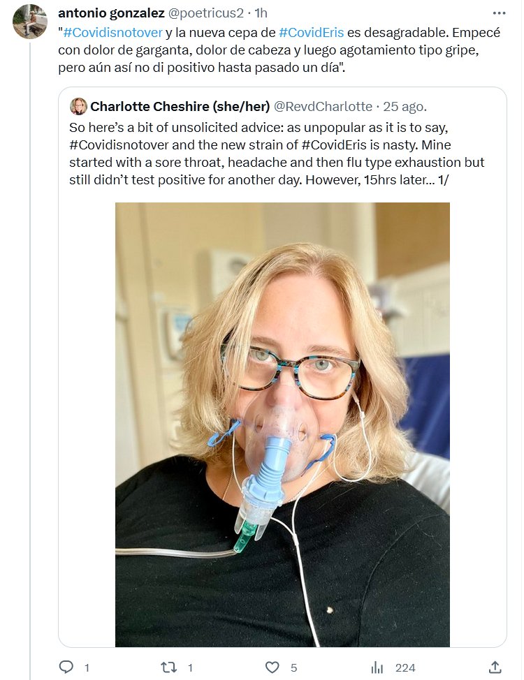 TESTIMONIOS «#Covidisnotover y la nueva cepa de #CovidEris es desagradable. Empecé con dolor de garganta, dolor de cabeza y luego agotamiento tipo gripe, pero aún así no di positivo hasta pasado un día».