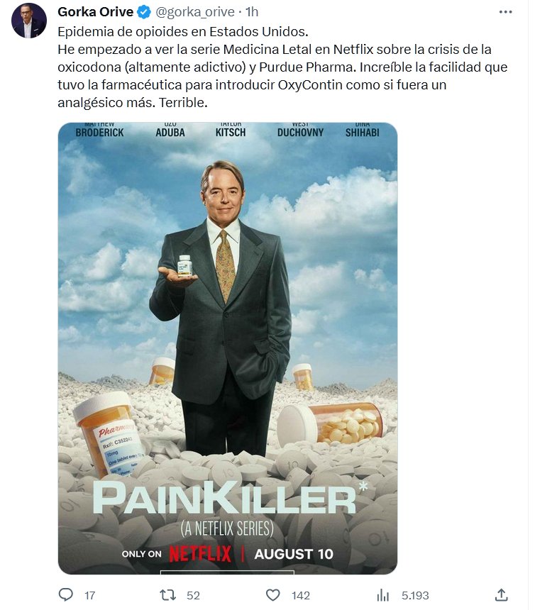 PESTE NARCOIMPERIO DEL MAL Epidemia de opioides en Estados Unidos. He empezado a ver la serie Medicina Letal en Netflix sobre la crisis de la oxicodona (altamente adictivo) y Purdue Pharma. Increíble la facilidad que tuvo la farmacéutica para introducir OxyContin como si fuera un analgésico más. Terrible.