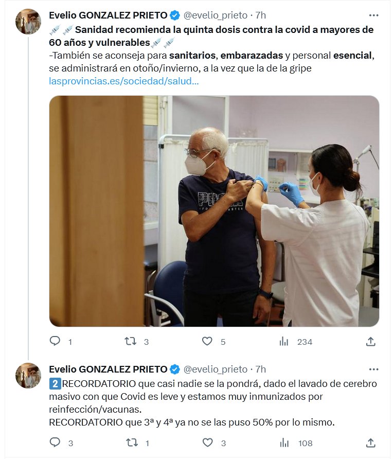 💉💉Sanidad recomienda la quinta dosis contra la covid a mayores de 60 años y vulnerables💉💉 -También se aconseja para sanitarios, embarazadas y personal esencial, se administrará en otoño/invierno, a la vez que la de la gripe