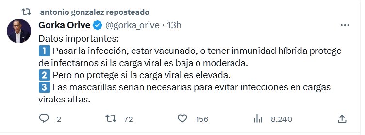 DR. HONORIS CAUSA DE LA UBA, INVESTIGADOR CIENTÍFICO, DR. Gorka Orive @gorka_orive · Datos importantes: 1️⃣ Pasar la infección, estar vacunado, o tener inmunidad híbrida protege de infectarnos si la carga viral es baja o moderada. 2️⃣ Pero no protege si la carga viral es elevada. 3️⃣ Las mascarillas serían necesarias para evitar infecciones en cargas virales altas.