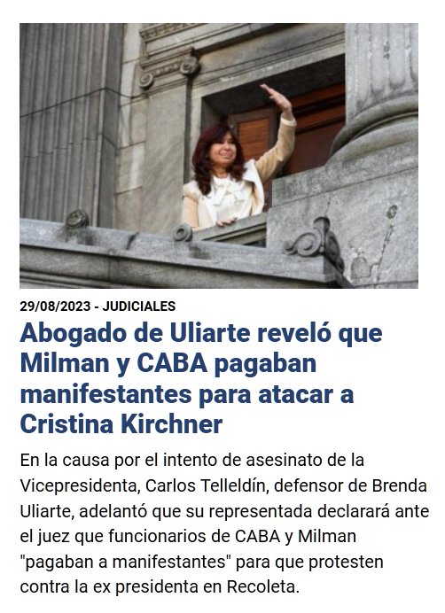 EL CORONAVIRUS NO ES EL ÚNICO ASESINO Abogado de Uliarte reveló que Milman y CABA pagaban manifestantes para atacar a Cristina Kirchner Posted on agosto 29, 2023 por coronado https://www.politicargentina.com/notas/202308/53062-abogado-de-uliarte-revelo-que-milman-y-caba-pagaban-manifestantes-para-atacar-a-cristina-kirchner.html