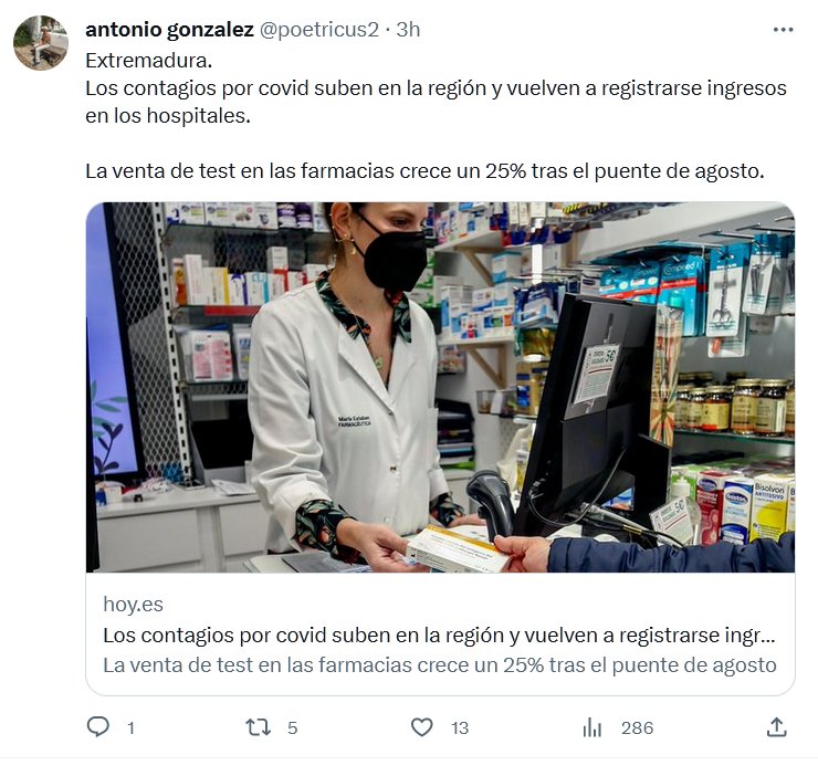 Extremadura. Los contagios por covid suben en la región y vuelven a registrarse ingresos en los hospitales. La venta de test en las farmacias crece un 25% tras el puente de agosto. Posted on agosto 29, 2023 por coronado