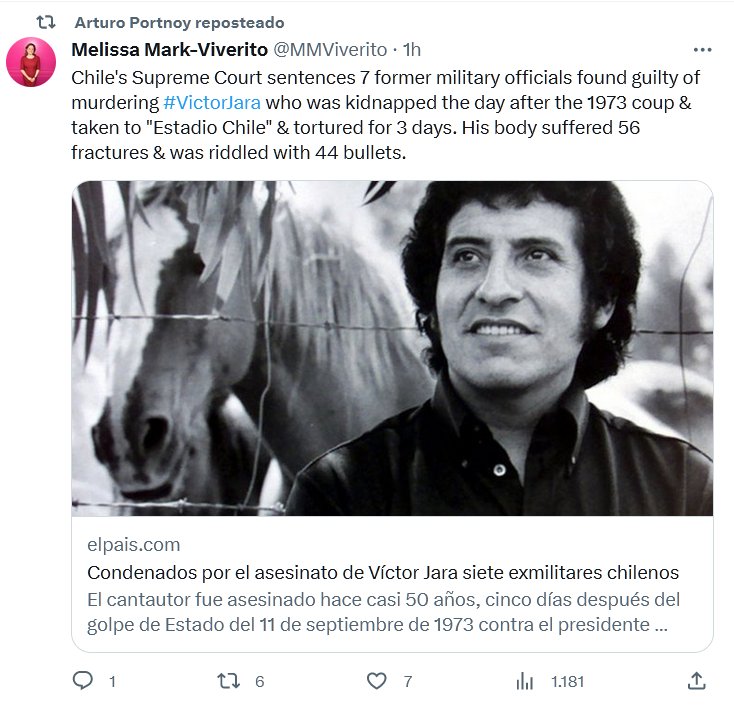LA COVID NO FUE LA ÚNICA ASESINA La Corte Suprema de Chile sentencia a 7 ex militares declarados culpables del asesinato de #VíctorJara, quien fue secuestrado el día después del golpe de 1973 y llevado al «Estadio Chile» y torturado durante 3 días. Su cuerpo sufrió 56 fracturas y fue acribillado por 44 balazos.