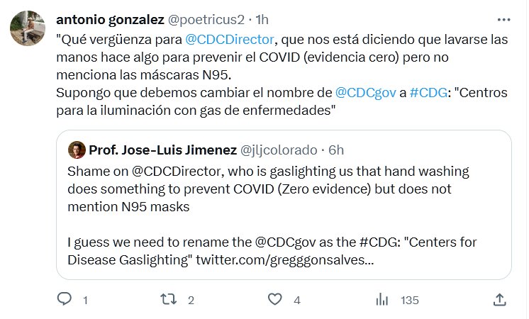 «Qué vergüenza para @CDCDirector , que nos está diciendo que lavarse las manos hace algo para prevenir el COVID (evidencia cero) pero no menciona las máscaras N95. Supongo que debemos cambiar el nombre de @CDCgov a #CDG: «Centros para «Gaslighting» de enfermedades»