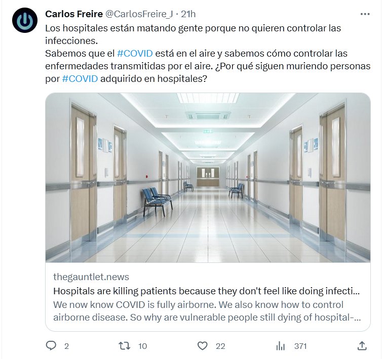 Los hospitales están matando gente porque no quieren controlar las infecciones. Sabemos que el #COVID está en el aire y sabemos cómo controlar las enfermedades transmitidas por el aire. ¿Por qué siguen muriendo personas por #COVID adquirido en hospitales?