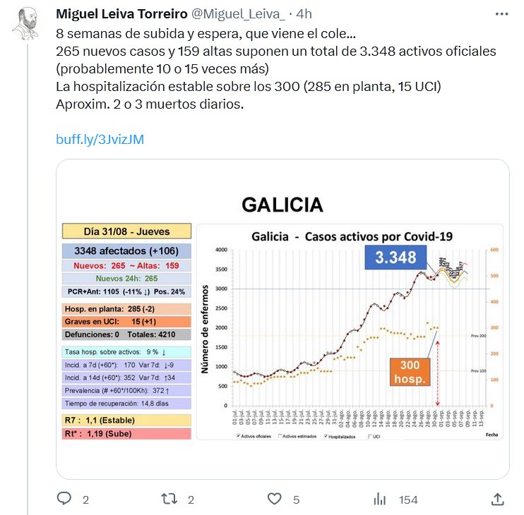 ESPAÑA APESTA 8 semanas de subida y espera, que viene el cole… 265 nuevos casos y 159 altas suponen un total de 3.348 activos oficiales (probablemente 10 o 15 veces más) La hospitalización estable sobre los 300 (285 en planta, 15 UCI) Aproxim. 2 o 3 muertos diarios