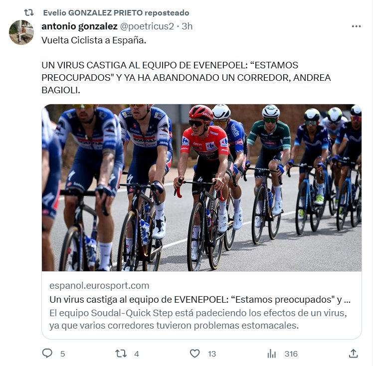NODIGASQUEESCOVID HACE ESTRAGOS Vuelta Ciclista a España. UN VIRUS CASTIGA AL EQUIPO DE EVENEPOEL: “ESTAMOS PREOCUPADOS» Y YA HA ABANDONADO UN CORREDOR, ANDREA BAGIOLI. Posted on agosto 31, 2023 por coronado