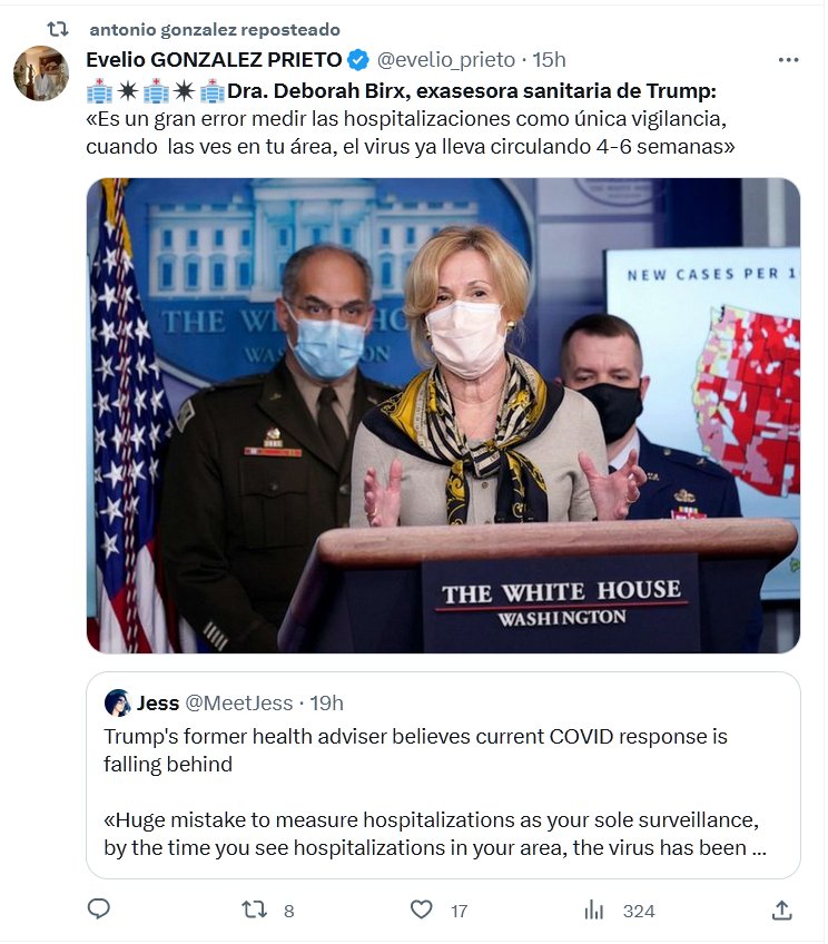 🏥✴️🏥✴️🏥Dra. Deborah Birx: «Es un gran error medir las hospitalizaciones como única vigilancia, cuando las ves en tu área, el virus ya lleva circulando 4-6 semanas» Posted on septiembre 1, 2023 por coronado