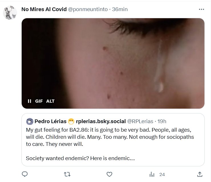 EN INGLÉS «Mi intuición sobre BA2.86: va a ser muy mala. Morirán personas de todas las edades. Los niños morirán. Muchos. Demasiados. No es suficiente para que a los sociópatas les importe. Nunca lo harán. ¿La sociedad quería endémica? Aquí está la endémico.»