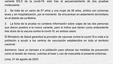 ES MUNDIAL Minsa confirma que variante EG.5 de COVID-19 llegó al Perú: hay dos pacientes contagiados Posted on septiembre 1, 2023 por coronado https://lobosnews.com.ar/minsa-confirma-que-variante-eg-5-de-covid-19-llego-al-peru-hay-dos-pacientes-contagiados/01/09/2023/