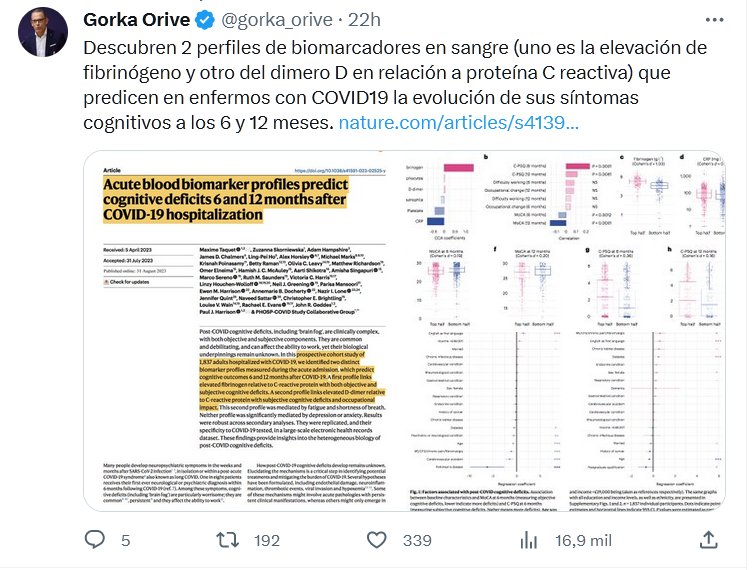 AL AÑO DE INFECTARSE! Descubren 2 perfiles de biomarcadores en sangre (uno es la elevación de fibrinógeno y otro del dimero D en relación a proteína C reactiva) que predicen en enfermos con COVID19 la evolución de sus síntomas cognitivos a los 6 y 12 meses