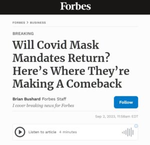 EN INGLÉS ¿Volverán los mandatos de máscara de Covid? Aquí es donde están regresando Posted on septiembre 2, 2023 por coronado https://www.forbes.com/sites/brianbushard/2023/09/02/will-covid-mask-mandates-return-heres-where-theyre-making-a-comeback/?sh=16806c2d7eca