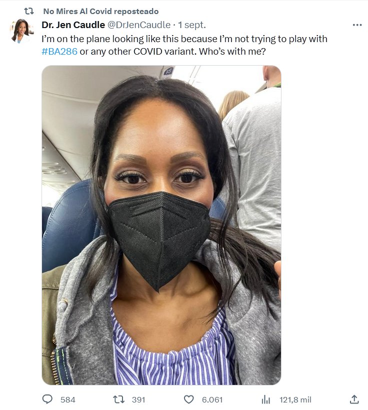 YO ESTOY CON UD.! EN INGLÉS Dra. Jen Caudle @DrJenCaudle · 1 de septiembre. Estoy en el avión con este aspecto porque no intento jugar con #BA286 ni ninguna otra variante de COVID. ¿Quien está conmigo?