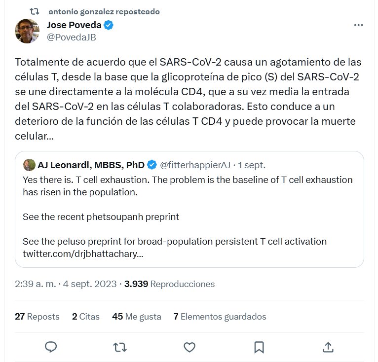 COVID≈SIDA Totalmente de acuerdo que el SARS-CoV-2 causa un agotamiento de las células T, desde la base que la glicoproteína de pico (S) del SARS-CoV-2 se une directamente a la molécula CD4, que a su vez media la entrada del SARS-CoV-2 en las células T colaboradoras. Esto conduce a un deterioro de la función de las células T CD4 y puede provocar la muerte celular…