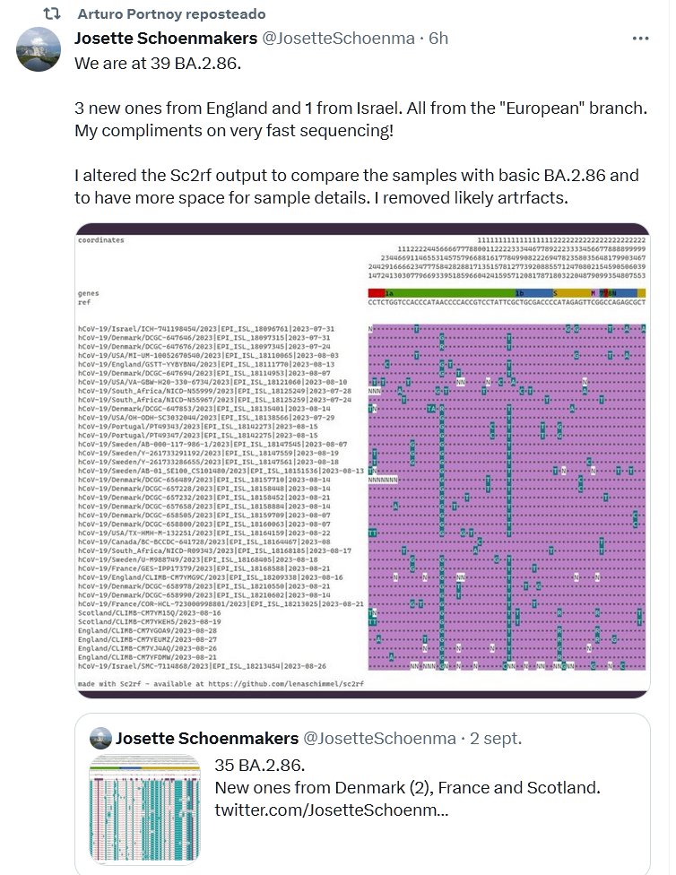 EN INGLÉS Estamos en 39 BA.2.86. 3 nuevos de Inglaterra y 1 de Israel. Todo de la rama «europea». ¡Mis felicitaciones por la secuenciación muy rápida! Posted on septiembre 4, 2023 por coronado