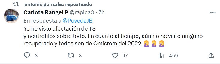 TESTIMONIOS MÉDICOS Carlota Rangel P @rapica3 · Yo he visto afectación de T8 y neutrofilos sobre todo. En cuanto al tiempo, aún no he visto ninguno recuperado y todos son de Omicrom del 2022 🤦♀️🤦♀️🤦♀️