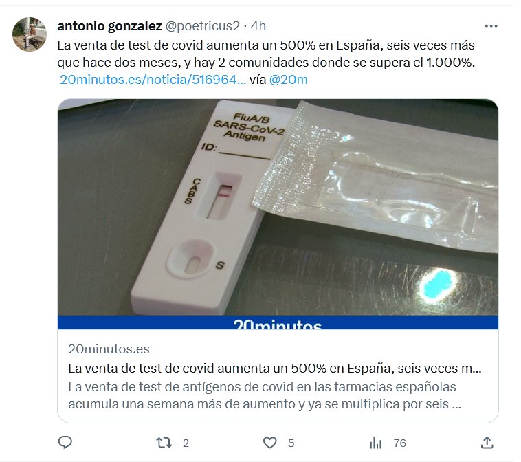 ESPAÑA APESTA La venta de test de covid aumenta un 500% en España, seis veces más que hace dos meses, y hay 2 comunidades donde se supera el 1.000%. Posted on septiembre 6, 2023 por coronado https://www.20minutos.es/noticia/5169644/0/venta-test-covid-aumenta-mas-un-500-seis-veces-mas-que-hace-dos-meses/