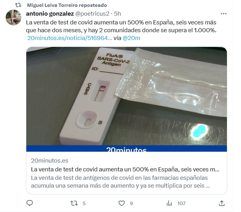 FIN DE PANDEMIA? La venta de test de covid aumenta un 500% en España, seis veces más que hace dos meses, y hay 2 comunidades donde se supera el 1.000%. Posted on septiembre 6, 2023 por coronado https://www.20minutos.es/noticia/5169644/0/venta-test-covid-aumenta-mas-un-500-seis-veces-mas-que-hace-dos-meses/
