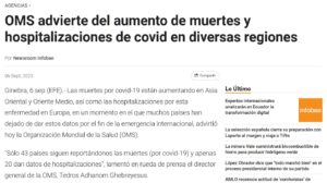 OTRA VEZ NO ERA LEVE! OMS advierte del aumento de muertes y hospitalizaciones de covid en diversas regiones Posted on septiembre 6, 2023 por coronado https://www.infobae.com/america/agencias/2023/09/06/oms-advierte-del-aumento-de-muertes-y-hospitalizaciones-de-covid-en-diversas-regiones/