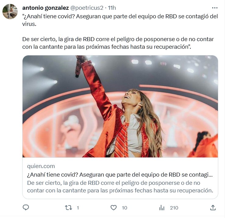 «¿Anahí tiene covid? Aseguran que parte del equipo de RBD se contagió del virus. De ser cierto, la gira de RBD corre el peligro de posponerse o de no contar con la cantante para las próximas fechas hasta su recuperación».