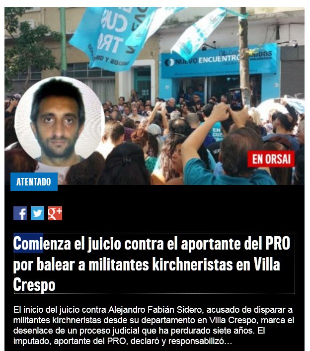 EL CORONAVIRUS NO ES EL ÚNICO ASESINO Comienza el juicio contra el aportante del PRO por balear a militantes kirchneristas en Villa Crespo, contra Alejandro Fabián Sidero Posted on septiembre 8, 2023 por coronado https://www.enorsai.com.ar/politica/39826-comienza-el-juicio-contra-el-aportante-del-pro-por-balear-a-militantes-kirchneristas-en-villa-crespo.html El Coro de Madres de Plaza de Mayo fue amenazado y filmado por un militar retirado