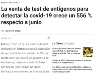 La venta de test de antígenos para detectar la covid-19 crece un 556 % respecto a junio Posted on septiembre 8, 2023 por coronado https://www.infobae.com/espana/agencias/2023/09/08/la-venta-de-test-de-antigenos-para-detectar-la-covid-19-crece-un-556-respecto-a-junio/