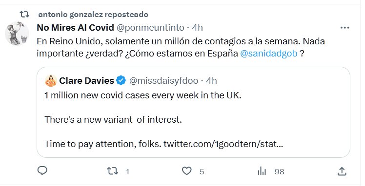 No Mires Al Covid @ponmeuntinto · En Reino Unido, solamente un millón de contagios a la semana. Nada importante ¿verdad? ¿Cómo estamos en España @sanidadgob ?