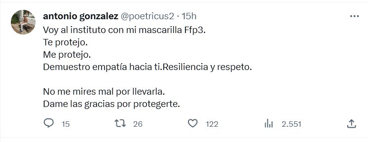 Voy al instituto con mi mascarilla Ffp3. Te protejo. Me protejo. Demuestro empatía hacia ti. Resiliencia y respeto. No me mires mal por llevarla. Dame las gracias por protegerte. Posted on septiembre 8, 2023 por coronado