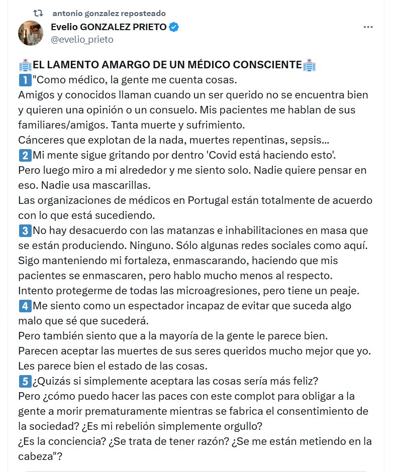 🏥EL LAMENTO AMARGO DE UN MÉDICO CONSCIENTE🏥 Mi mente sigue gritando por dentro ‘Covid está haciendo esto’. Pero luego miro a mi alrededor y me siento solo. Nadie quiere pensar en eso. Nadie usa mascarillas.