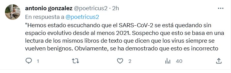 «Hemos estado escuchando que el SARS-CoV-2 se está quedando sin espacio evolutivo desde al menos 2021. Sospecho que esto se basa en una lectura de los mismos libros de texto que dicen que los virus siempre se vuelven benignos. Obviamente, se ha demostrado que esto es incorrecto»