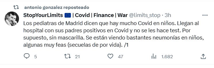 LESA HUMANIDAD Los pediatras de Madrid dicen que hay mucho Covid en niños. Llegan al hospital con sus padres positivos en Covid y no se les hace test. Por supuesto, sin mascarilla. Se están viendo bastantes neumonías en niños, algunas muy feas (secuelas de por vida)