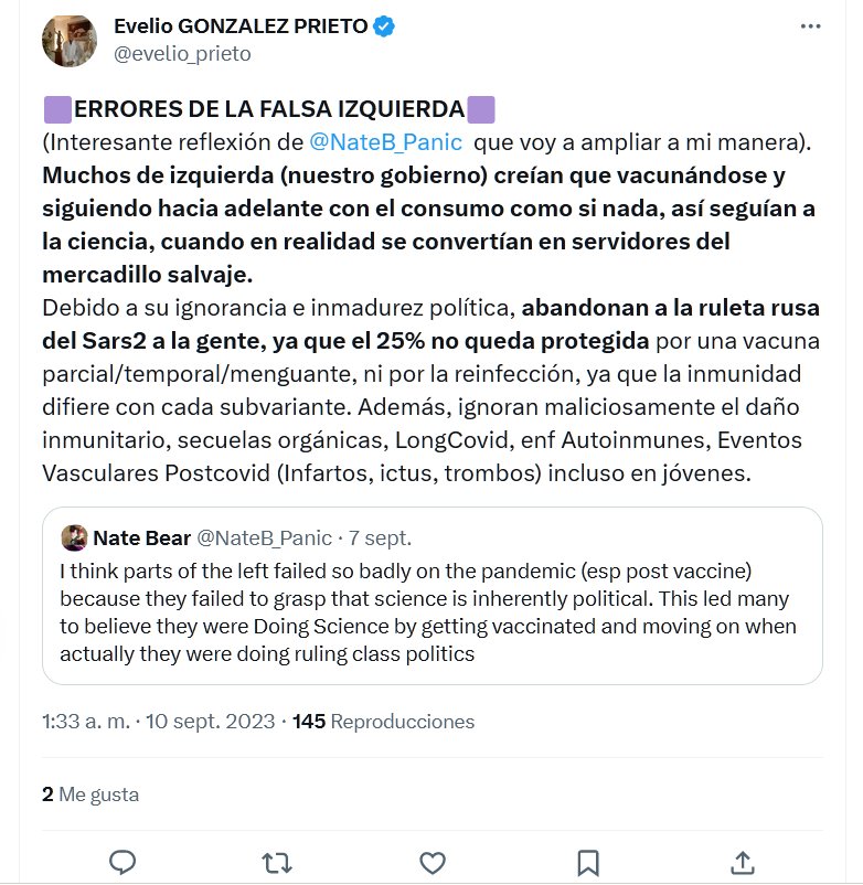 Muchos de izquierda (nuestro gobierno) creían que vacunándose y siguiendo hacia adelante con el consumo como si nada, así seguían a la ciencia, cuando en realidad se convertían en servidores del mercadillo salvaje. Debido a su ignorancia e inmadurez política, abandonan a la ruleta rusa del Sars2 a la gente, ya que el 25% no queda protegida por una vacuna parcial/temporal/menguante, ni por la reinfección, ya que la inmunidad difiere con cada subvariante. Además, ignoran maliciosamente el daño inmunitario, secuelas orgánicas, LongCovid, enf Autoinmunes, Eventos Vasculares Postcovid (Infartos, ictus, trombos) incluso en jóvenes.