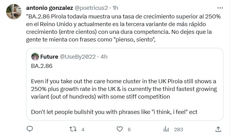 «BA.2.86 Pirola todavía muestra una tasa de crecimiento superior al 250% en el Reino Unido y actualmente es la tercera variante de más rápido crecimiento (entre cientos) con una dura competencia. No dejes que la gente te mienta con frases como «pienso, siento»,