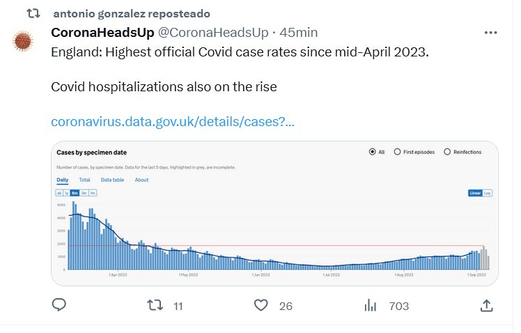 EN INGLÉS Inglaterra: Tasas oficiales de casos de Covid más altas desde mediados de abril de 2023. Las hospitalizaciones por Covid también van en aumento Posted on septiembre 11, 2023 por coronado https://coronavirus.data.gov.uk/details/cases?areaType=nation&areaName=England