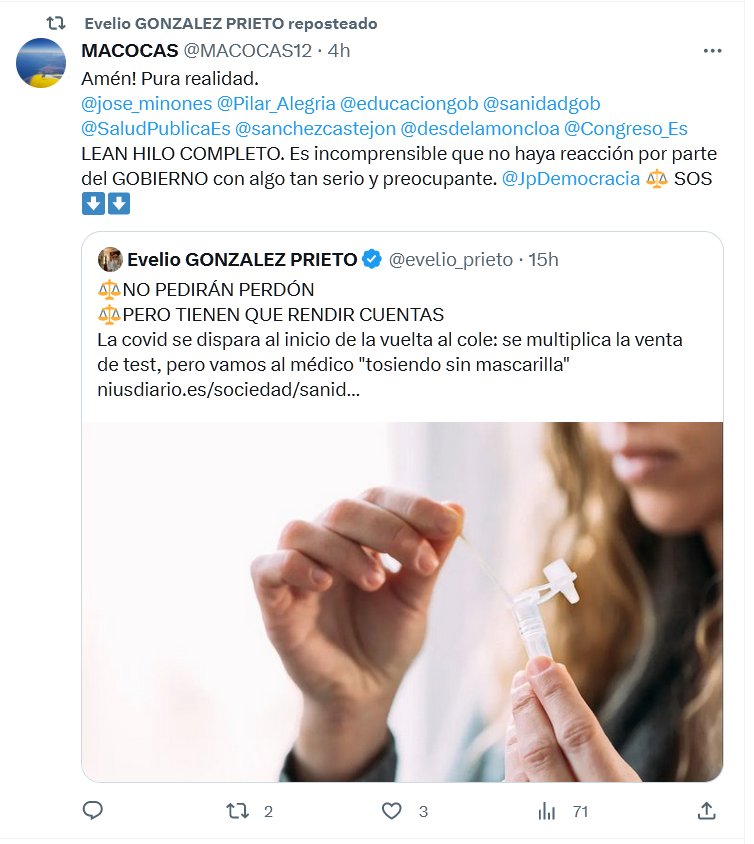 GENOCIDIO EN CURSO Es incomprensible que no haya reacción por parte del GOBIERNO con algo tan serio y preocupante La covid se dispara al inicio de la vuelta al cole: se multiplica la venta de test, pero vamos al médico «tosiendo sin mascarilla»