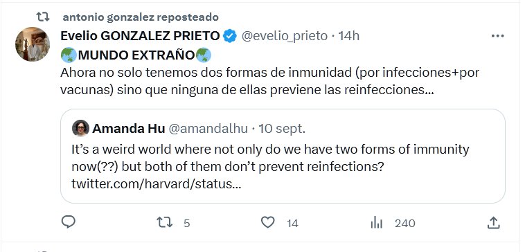 🌏MUNDO EXTRAÑO🌏 Ahora no solo tenemos dos formas de inmunidad (por infecciones+por vacunas) sino que ninguna de ellas previene las reinfecciones… Posted on septiembre 12, 2023 por coronado