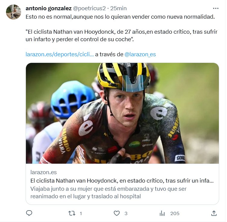 NOCOVID HACE ESTRAGOS Esto no es normal,aunque nos lo quieran vender como nueva normalidad. «El ciclista Nathan van Hooydonck, de 27 años,en estado crítico, tras sufrir un infarto y perder el control de su coche».