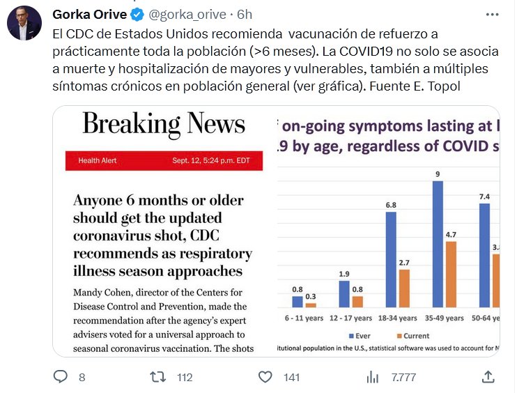 Gorka Orive @gorka_orive · El CDC de Estados Unidos recomienda vacunación de refuerzo a prácticamente toda la población (>6 meses). La COVID19 no solo se asocia a muerte y hospitalización de mayores y vulnerables, también a múltiples síntomas crónicos en población general
