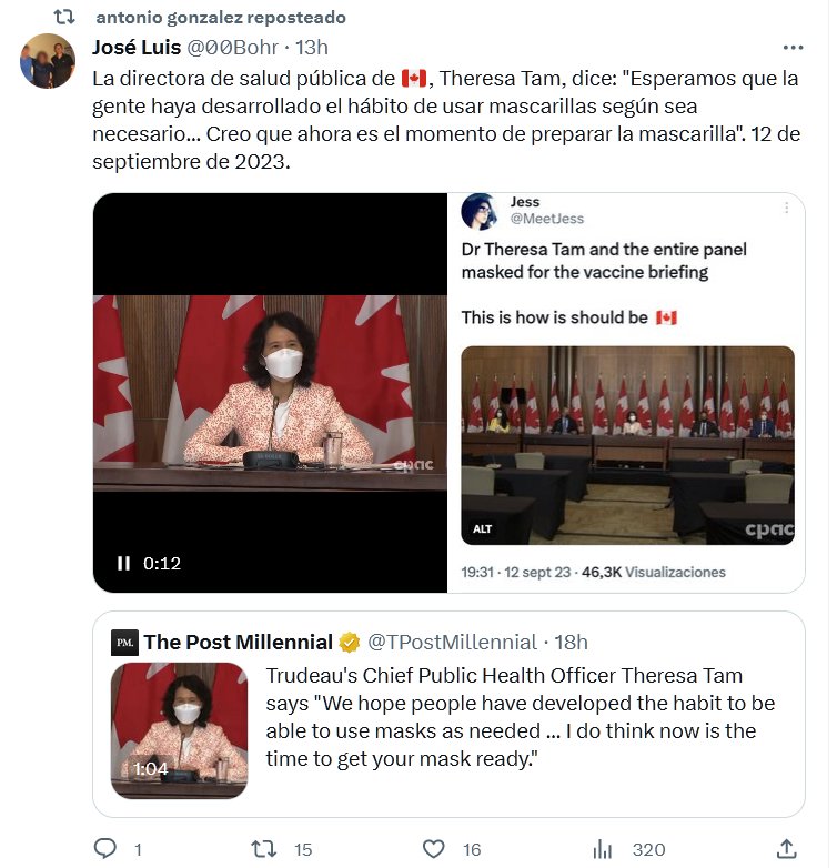 La directora de salud pública de 🇨🇦, Theresa Tam, dice: «Esperamos que la gente haya desarrollado el hábito de usar mascarillas según sea necesario… Creo que ahora es el momento de preparar la mascarilla». 12 de septiembre de 2023.