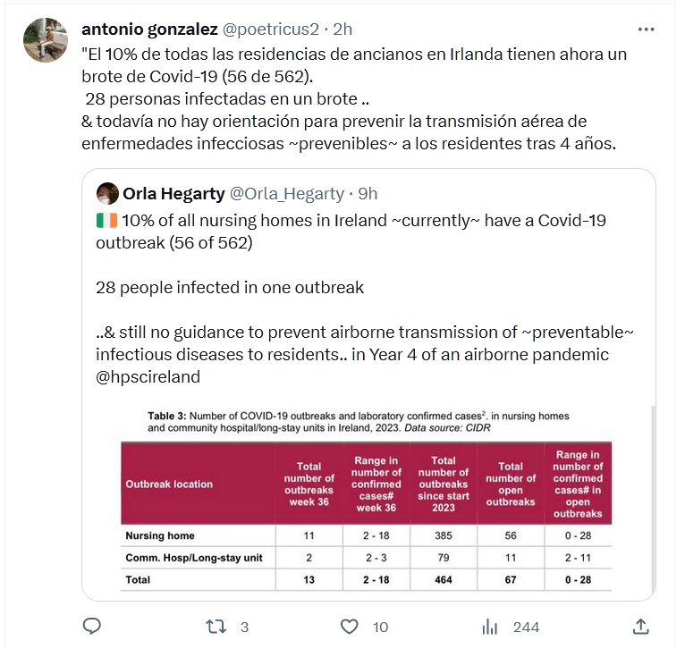 «El 10% de todas las residencias de ancianos en Irlanda tienen ahora un brote de Covid-19 (56 de 562). Posted on septiembre 14, 2023 por coronado