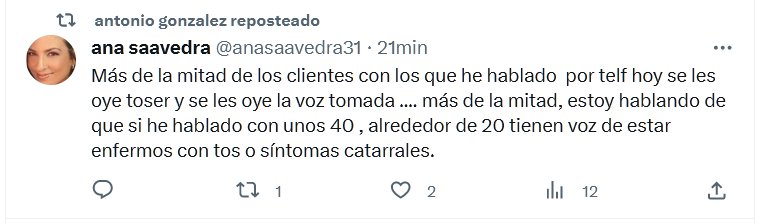 NODIGASQUEESCOVID HACE ESTRAGOS! TESTIMONIOS Más de la mitad de los clientes con los que he hablado por telf hoy se les oye toser y se les oye la voz tomada …. más de la mitad, estoy hablando de que si he hablado con unos 40 , alrededor de 20 tienen voz de estar enfermos con tos o síntomas catarrales.