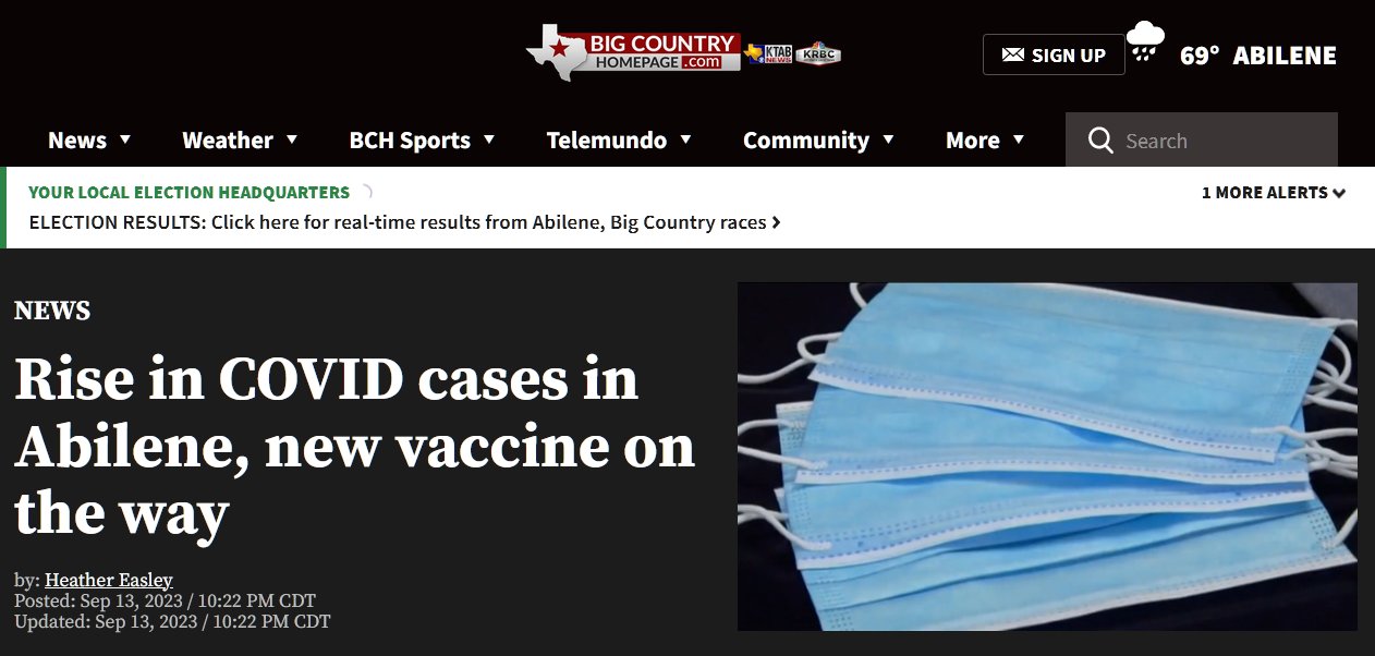 TEXAS (EN INGLÉS) Aumento de casos de COVID en Abilene, nueva vacuna en camino Posted on septiembre 14, 2023 por coronado https://www.bigcountryhomepage.com/news/rise-in-covid-cases-in-abilene-new-vaccine-on-the-way/
