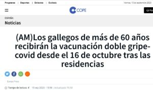ESPAÑA Los gallegos de más de 60 años recibirán la vacunación doble gripe-covid desde el 16 de octubre tras las residencias Posted on septiembre 15, 2023 por coronado https://www.cope.es/actualidad/espana/noticias/amlos-gallegos-mas-anos-recibiran-vacunacion-doble-gripe-covid-desde-octubre-tras-las-residencias-20230915_2900841